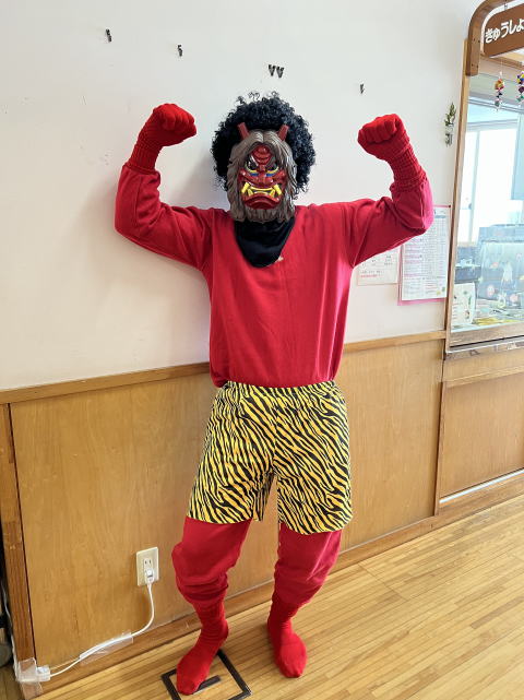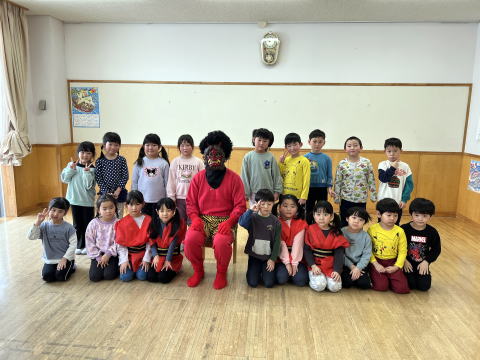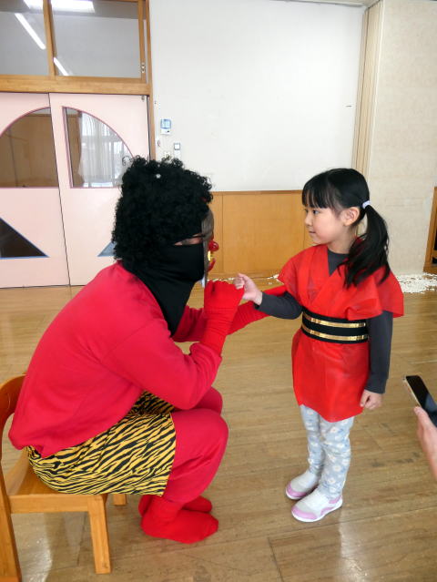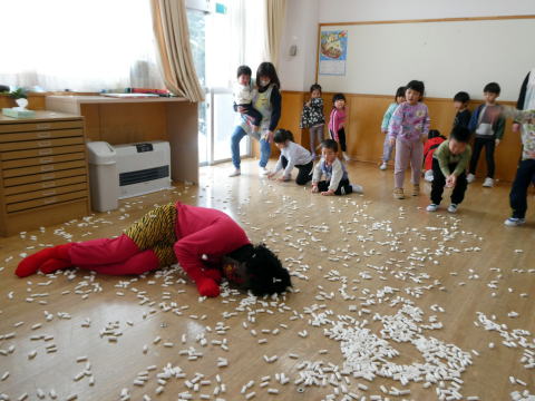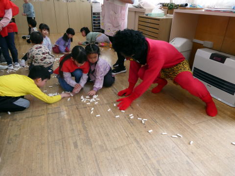 | みんなで豆まきをしました。怖かったけど勇気を出しました! |