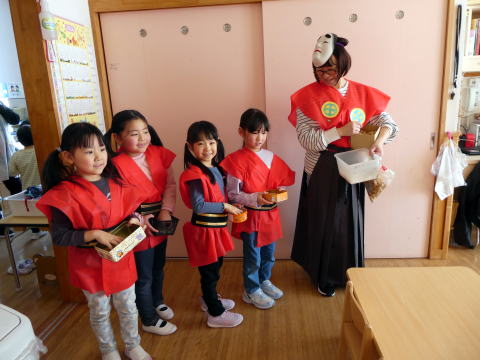 | ぞう組の女の子がお福になり「鬼はそと~福は内~」各部屋に豆をまきました。 |